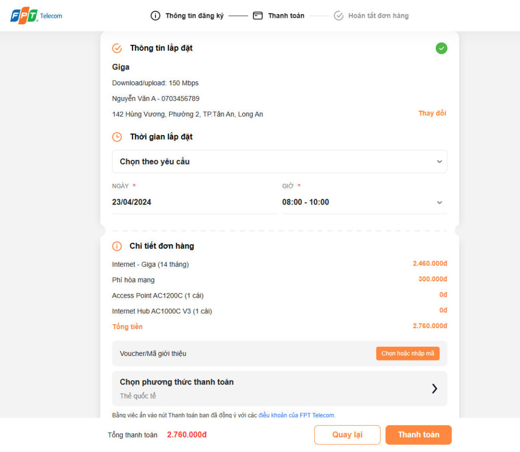 Chọn gói cước theo thời hạn sử dụng mong muốn như 6 tháng hoặc 12 tháng và đồng ý với thời gian lắp đặt mà FPT đề xuất. Nhân viên FPT sẽ liên hệ để xác nhận lại thông tin và sắp xếp lịch lắp đặt thuận tiện cho cả hai bên.